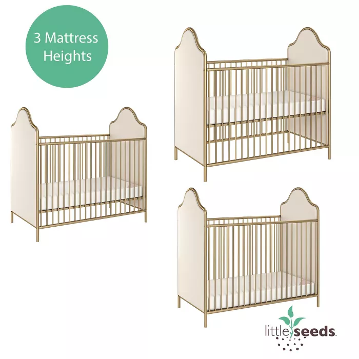 For the classically minded designer with a finger on the pulse of today’s trends, we are proud to introduce the Little Seeds Piper Upholstered Convertible Cream Metal Crib. With its beautifully upholstered side panels and elegantly arched metal frame, The Little Seeds Piper Upholstered Convertible Cream Metal Crib will become the center piece of your modern little one’s nursery decor. The cream metal crib mattress support adjusts to 3 different heights as your child grows, giving you a stylishly functional piece that will last longer than the night time feedings will. This beautiful baby crib also converts to a toddler bed with the Little Seeds Piper Toddler Rail Crib Conversion Kit which is sold separately. For added peace of mind, the Little Seeds Piper Upholstered Convertible Metal Crib meets or exceeds the CPSIA Juvenile testing requirements. Little Seeds not only creates this and many more on trend baby and kids’ furniture pieces, we also partner with various environmental protection programs to protect pollinator and other wildlife habitats for future generations.